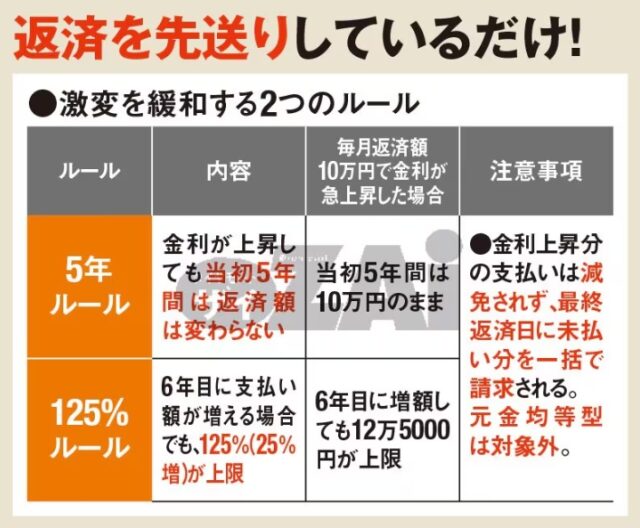 まず、多くの人が利用している「変動金利」には、金利が急騰しても生活が破綻しないよう、5年ルール(5年間は月々の返済額を変えない)と、125%ルール(5年後の改定時も、前の返済額の1.25倍までしか上げない)という激変緩和の仕組みがあります。